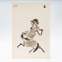 Aqui, dois cavalos sobem em curvas opostas, como num salto coreografado. O nanquim varia do cinza translúcido aos acentos escuros nas crinas e patas, construindo volume sem contorno excessivo. A verticalidade sugere impulso; as reservas do papel dão ar e pausa. Um estudo de energia e equilíbrio — movimento sem ruído.