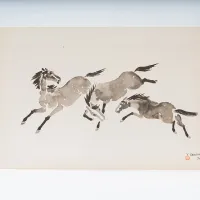 Nesta prancha horizontal, três cavalos cruzam o plano em ritmos distintos, compondo uma sequência de corrida. Lavagens de nanquim constroem volumes leves; acentos escuros nas crinas e nos cascos marcam o pulso do movimento. Sem contorno rígido, o espaço em branco conduz a leitura e amplia a sensação de vento. Síntese e cadência — a energia do grupo em estado essencial.