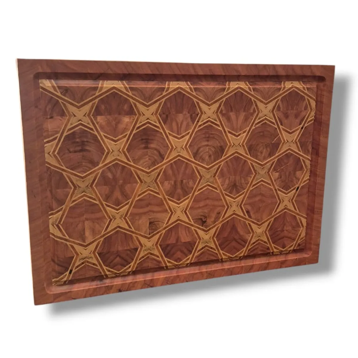 Esta tábua de churrasco é construída a partir de marchetaria geométrica, com um desenho contínuo e entrelaçado que se forma a partir do encaixe preciso de pequenos blocos de madeira. O padrão não é decorativo nem aplicado: ele nasce da própria construção da peça, bloco por bloco.