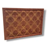 A base da tábua é predominantemente em pau-ferro, madeira densa, estável e de veios marcantes, que confere profundidade visual e robustez estrutural. O desenho geométrico é definido por linhas em marfim, que criam contraste, ritmo e leitura clara do padrão, valorizando o trabalho artesanal da marchetaria.