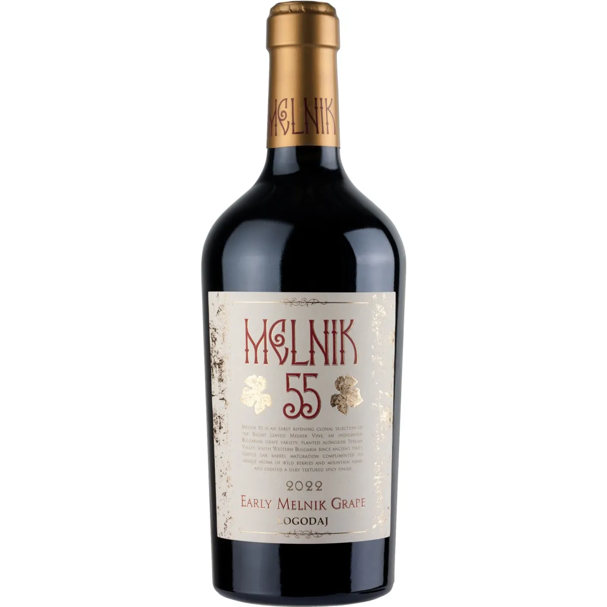 O Logodaj Melnik 55 é um vinho tinto emblemático da Bulgária, elaborado a partir da uva autóctone Melnik (Siroka Melniska) — uma variedade rara, cultivada principalmente no Vale do Struma, conhecida por originar vinhos estruturados, especiados e de grande profundidade.